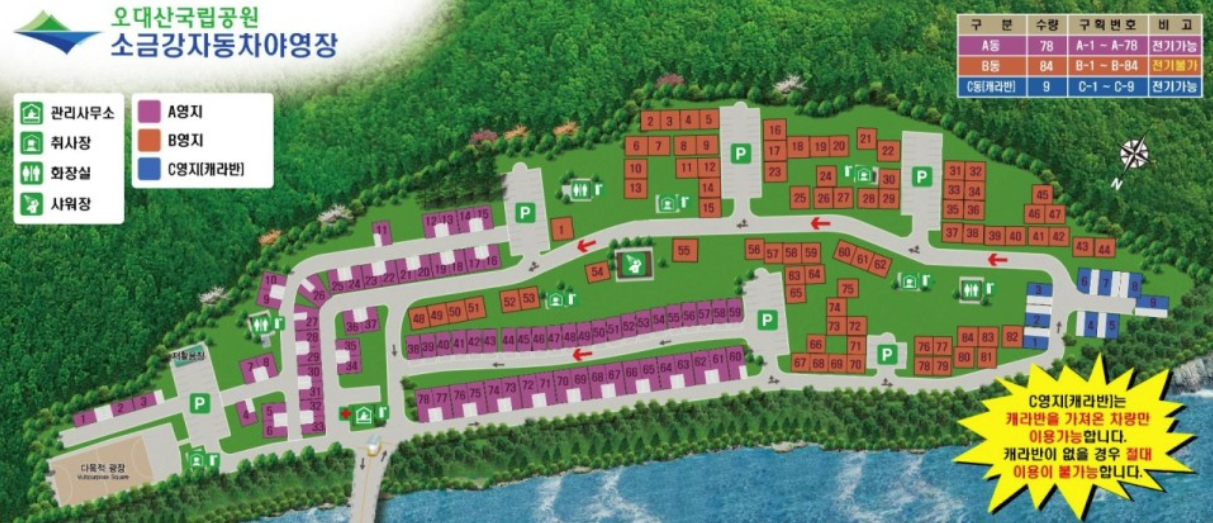 근처에는 매점도 있어서 음료나 간단한 먹을거리도 구매할 수 있구요. 소금강 자동차 야영장도 5월에서 10월말까지만 운영하고 겨울에는 휴장하니 이용기간도 확인하시고 방문하시기 바랍니다.