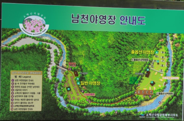 두 번째는 소백산 남천야영장입니다. 충북 단양군 영춘면 남천리에 위치하고 있습니다.
