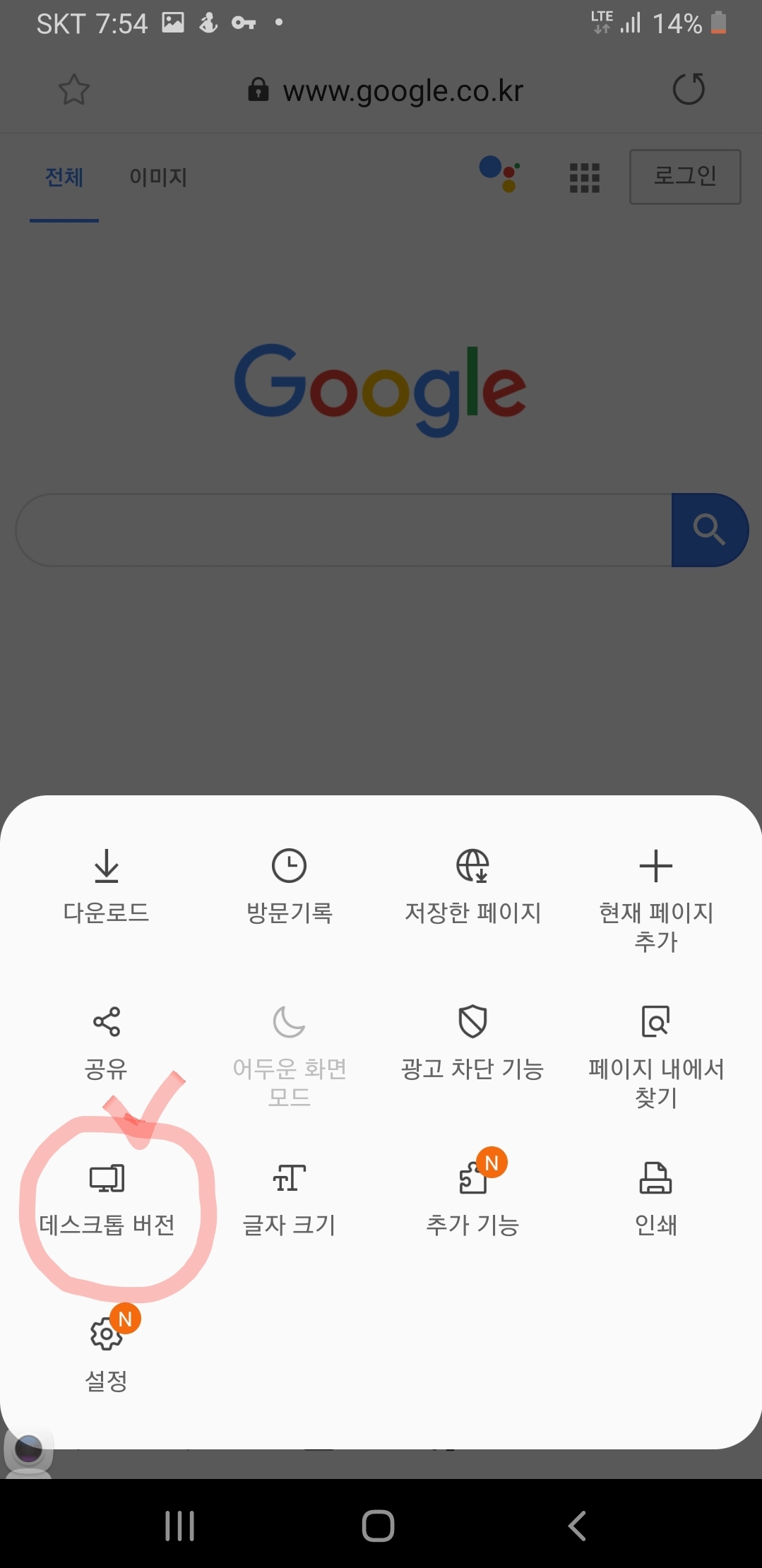 수많은 메뉴들 중에서 아래쪽에 위치한 “데스크톱 버전” 을 눌러주세요. 이는 핸드폰으로 보는 인터넷 화면을 컴퓨터에서 보는 것처럼 보여주는 것입니다.