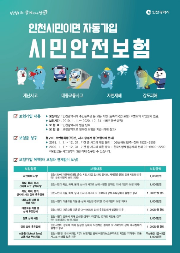제가 있는 인천은 위와 같이 자연재해 사망, 폭발, 대중교통, 강도, 스쿨존 교통사고 부상 치료 등 다양한 보장 항목이 있고 타 보험과 관계없이 보상이 되고 있습니다. 이외에 지자체마다 보장 항목이 조금씩 다른데 농촌 지역은 농업인 안전보험에 가입해서 농작업 중 안전사고에 대한 보험제도도 있습니다.