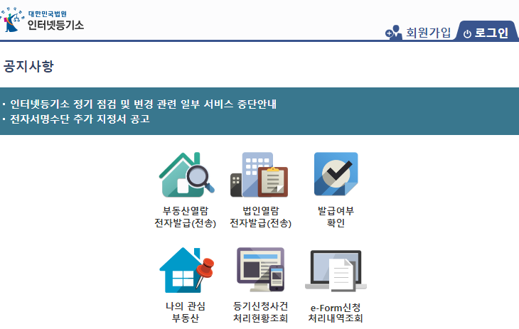 세를 얻거나 집을 살 때 반드시 확인해야 하는 서류 중 하나인 등기사항전부증명서를 컴퓨터로 집에서 손 쉽게 발급받을 수 있는 사이트입니다.