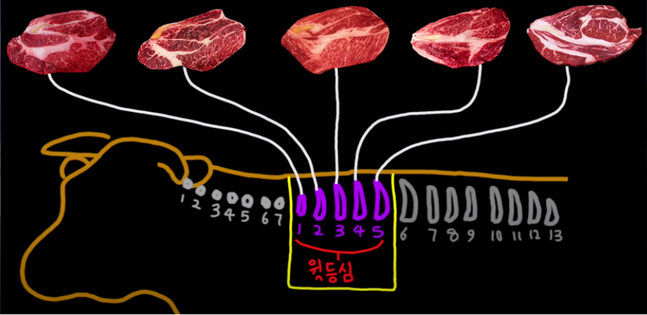 윗등심에서 중요한 부위는 살치살입니다. 맛있는 부위지만 질긴 부분도 너무 많이 포함되어있지요. 결론적으로 말하면 빗살무늬의 살치살이 있는 고기가 좋은 고기입니다.
