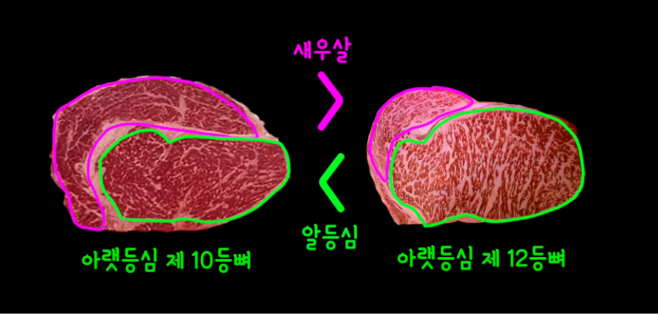 식당의 메뉴판만 보아도 등심 < 꽃등심 < 살치살 < 새우살 순으로 부드러운 부위일 수록 가격도 비싸집니다.