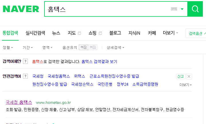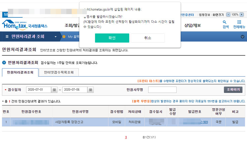 이제 사업자등록증을 발급받아 PDF로 저장을 해야 되겠지요. 일단 네이버 창에서 홈텍스로 들어갑니다. 사업자등록증을 신청한 상태니 내 민원처리결과 조회 화면으로 들어갑니다.