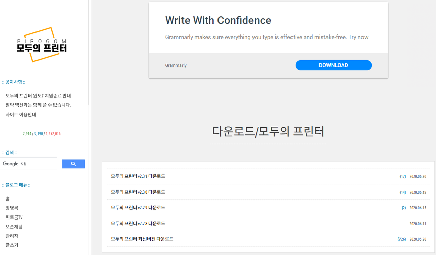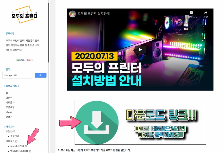 여기 편하게 링크를 걸어드릴게요. 다른 설치 비용 등도 없이 편하게 사용할 수 있습니다. 모두의 프린터 공식블로그에 들어가 다운로드 탭에서 최신버전을 설치를 해줍니다.