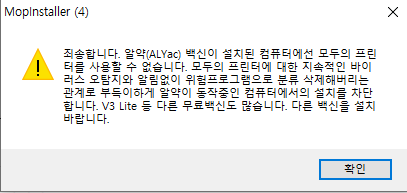 모두의 프린터를 다운로드 받았지만 설치가 안되고 위와 같은 메세지가 뜨는 경우가 있습니다.
