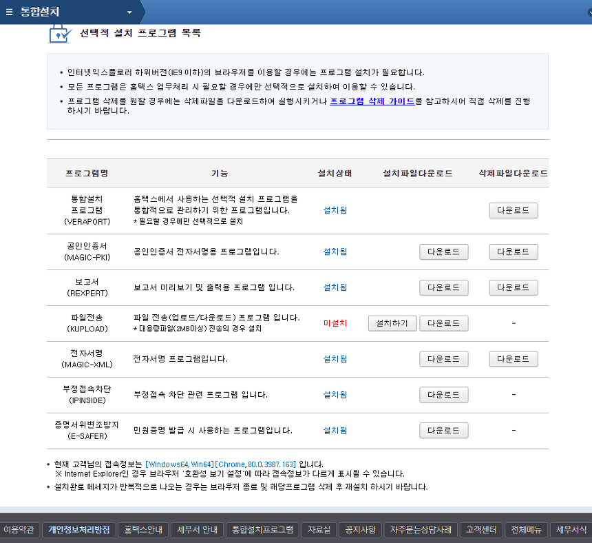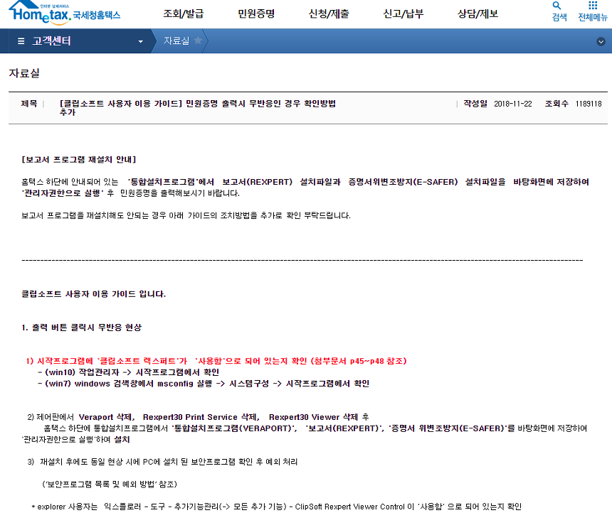 발급하기를 눌러도 프린트 출력 화면으로 넘어가지 않는 경우가 있습니다. 이에 대해 홈텍스에서는 ‘클립소프트 렉스퍼트’ 관련 사용함으로 변경을 하고 재설치를 진행을 하라고 친절하게 나와있습니다.