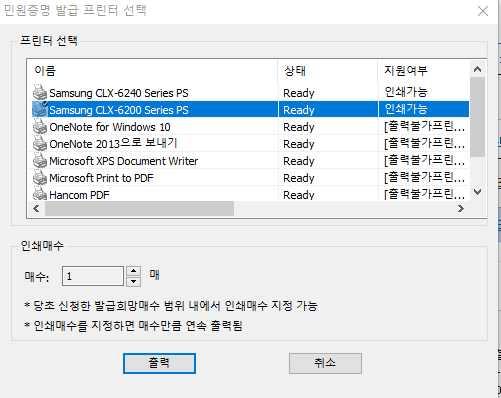 그럼 이제 다시 발급하기 누르면 위와 같이 민원증명 발급 프린터 선택이 나오는데 인쇄가능이라고 나오는 부분을 출력을 하면 됩니다. 참 쉽죠.