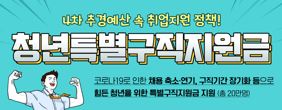 코로나19로 청년취업난이 심화되면서 고용노동부가 적극적 구직의사를 가진 저소득 미취업 청년 20만명에게 ‘청년특별구직지원금’을 지원한다고 합니다.