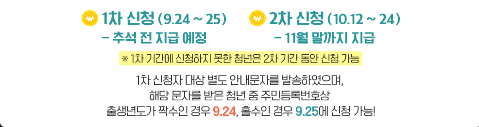 많은 청년들이 지원할 것을 대비해 홀짝제로 신청을 받는데, 태어난 연도 끝자리가 짝수면 24일, 홀수면 25일에 신청을 하면 됩니다.