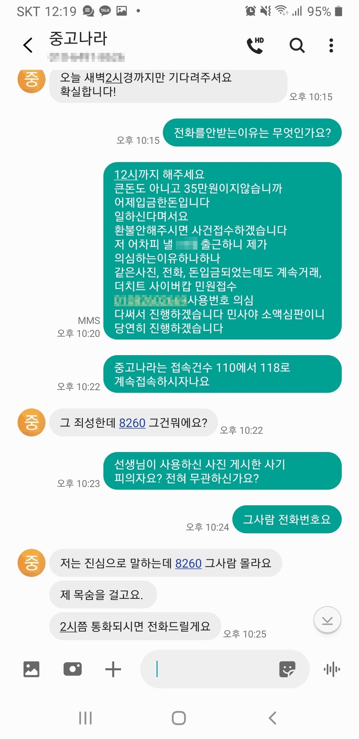 중고나라에서 사기를 당하는 분이 많습니다. 점점 믿고 살기 힘든세상이 되는 것 같습니다. 저도 몇일전 중고나라에서 사기를 당하였고, 2일에 걸쳐 문자를 보내 겨우 돈을 돌려받았습니다.