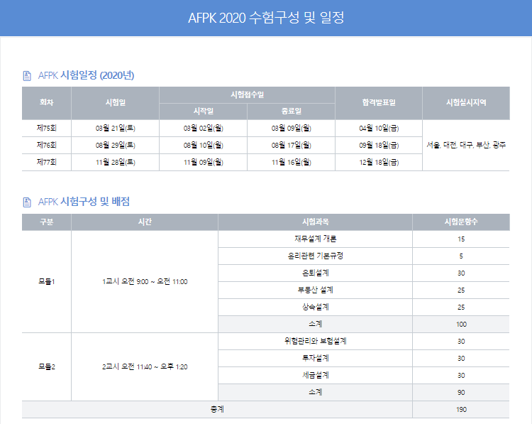 그러나 AFPK 자격증은 과목이 많은 편이므로 한 달 동안 꾸준히 공부하여야 합니다. AFPK 자격증 시험은 오는 8월 29일 시험이 있으니 꾸준히 준비하셨던 분들은 좋은 성과 있기를 바랍니다. 시험 일정이 계속 있으니 지금부터 준비하신다면 여유있게 취득할 수 있을 것입니다.
