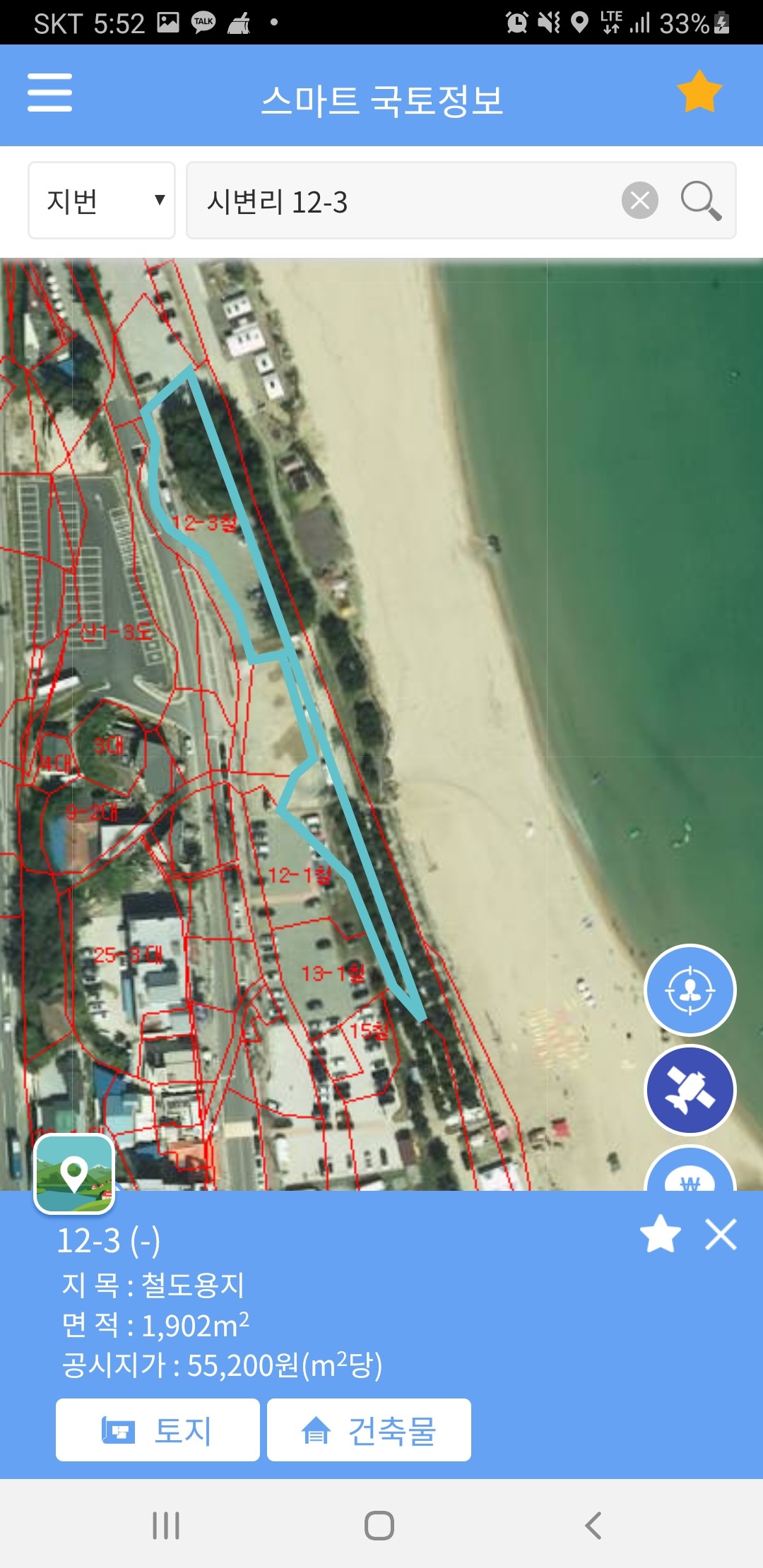 위와 같이 항공사진 화면으로도 볼 수가 있구요. 그럼 죽도해변의 앞에 주차가 가능할 것으로 보이는 ‘강원도 양양군 현남면 시변리 12-3’ 를 선택해 준 뒤 ‘토지’를 클릭해 줍니다.