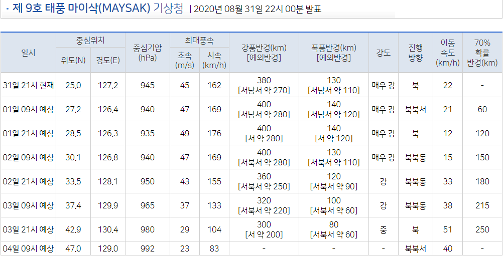 9호 태풍은 현재 중심기압 950hPa, 강풍반경은 약 380㎞이고, 최대풍속은 시속 155㎞(초속 43m)의 강한 수준입니다. 현재 일본 오키나와 남쪽 약 270㎞ 부근 해상에서 시속 37㎞의 속도로 북북서진하고 있습니다.