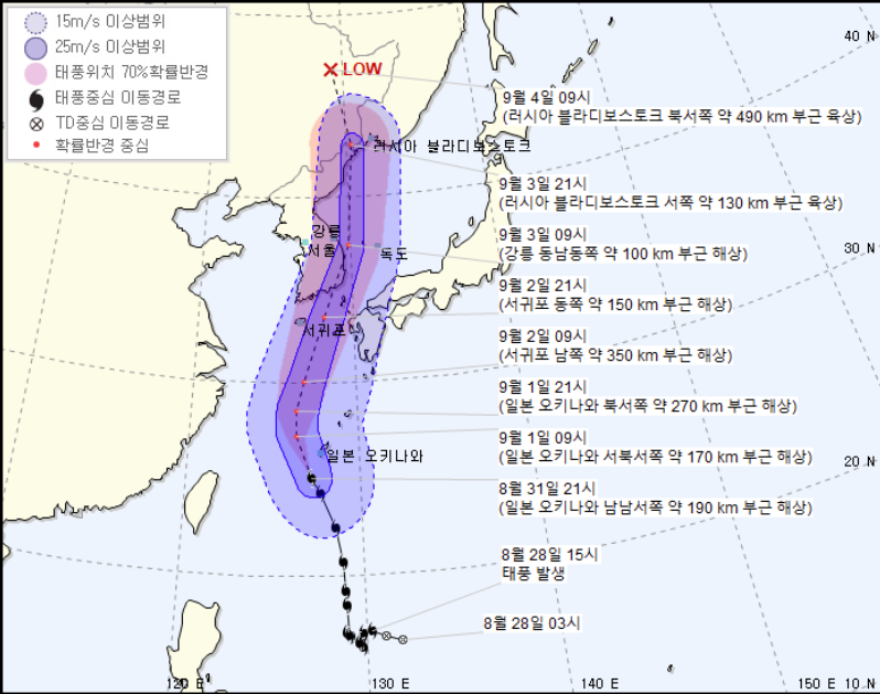태풍이 이동 경로 상에 분포한 30도 안팎의 고수온 해역을 느리게 지나면서 많은 양의 수증기를 공급받아 중심기압이 935hPa까지 매우 강하게 발달하고 제주도 동쪽 해상으로 진입할 때도 940hPa 안팎의 매우 강한 강도를 유지할 것으로 예상된다고 하는데요.